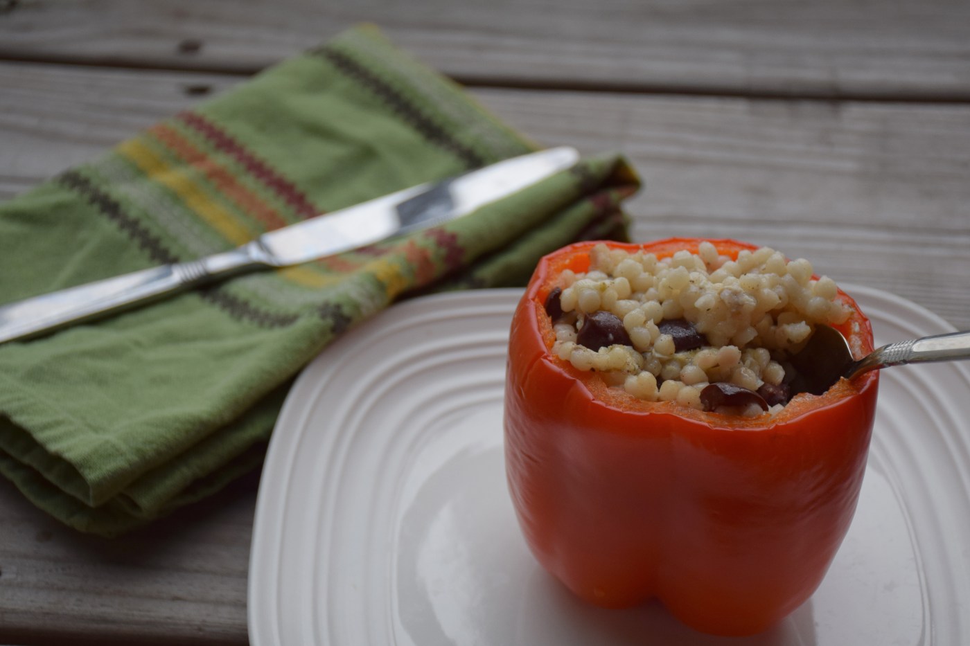 Tonight, I decided to go a little different route. I was thinking that the flavors of the Mediterranean would go perfectly, stuffed inside a tasty pepper. The flavors of this dish are a little more subtle than your big, bold, Tex-Mex stuffed pepper, but are delicious in their own right. And yes, I am aware that feta cheese would be the perfect addition to this recipe, but alas, I had none. I didn’t feel like hitting up the grocery store twice in one day once I came up with this idea. Furthermore, just the hint of Asiago allows the other flavors to shine through!