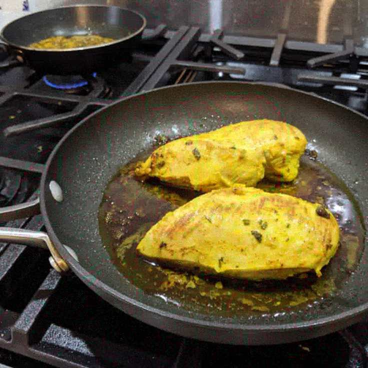 - Heat the coconut oil in a large skillet over medium heat. Once the pan is hot and oil is liquified, cook the chicken for 2 minutes on each side.