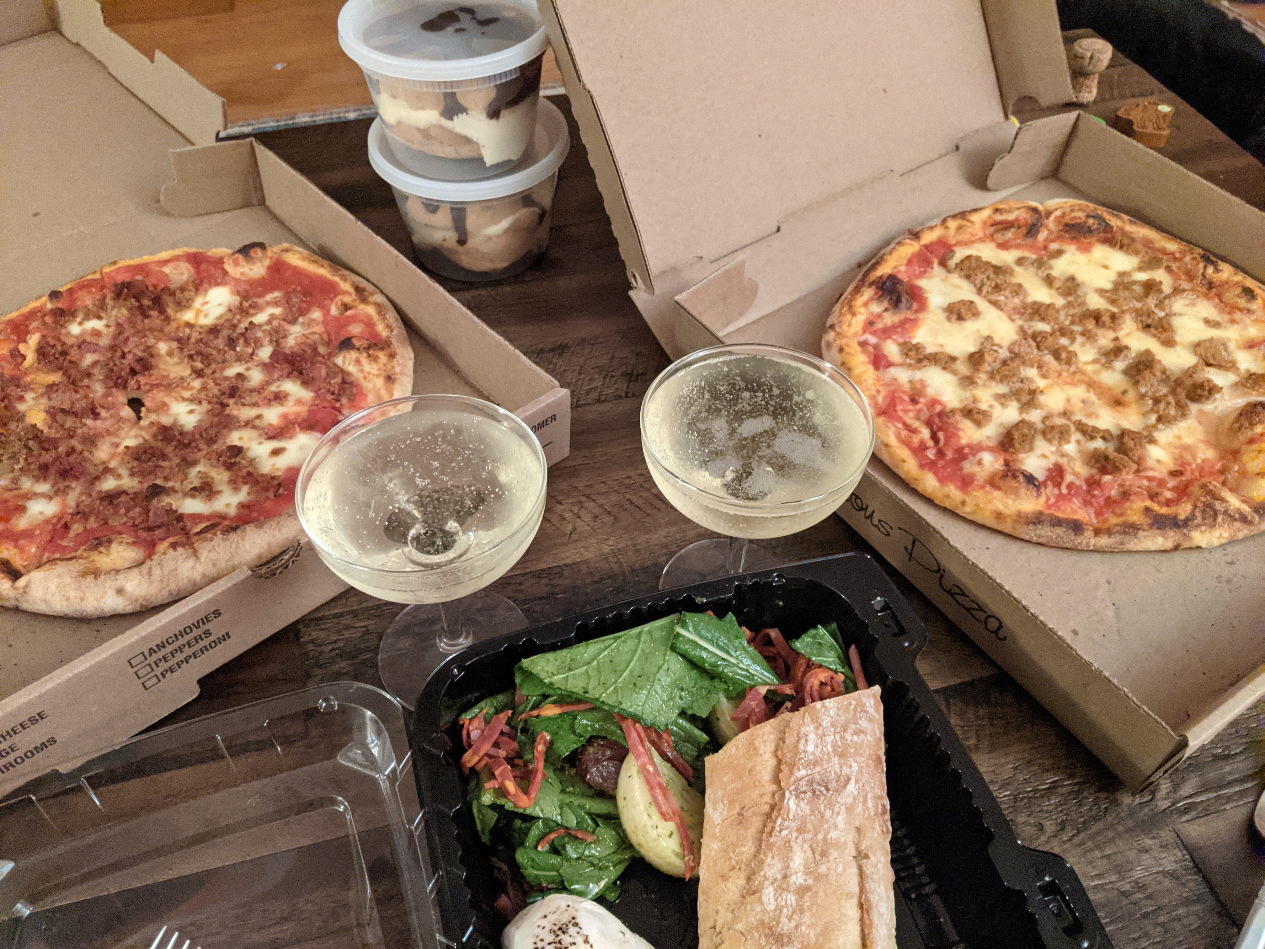 In true 2020 fashion, we had takeout for New Year’s Eve dinner this year. We turned to our favorite, which we’ve been eating at least a few times a month throughout this year, so it seemed fitting. Billy Pie is a great neighborhood spot, with amazing wood-fired pizzas. The menu is fairly small, but ALL of their food is delicious. Our NYE dinner included two pizzas, the burrata (which is always accompanied by an ever-changing, interesting salad for topping), and two cream puffs! We paired this with a King Family Vineyard brut, because we’re fancy and it’s New Year’s Eve!
