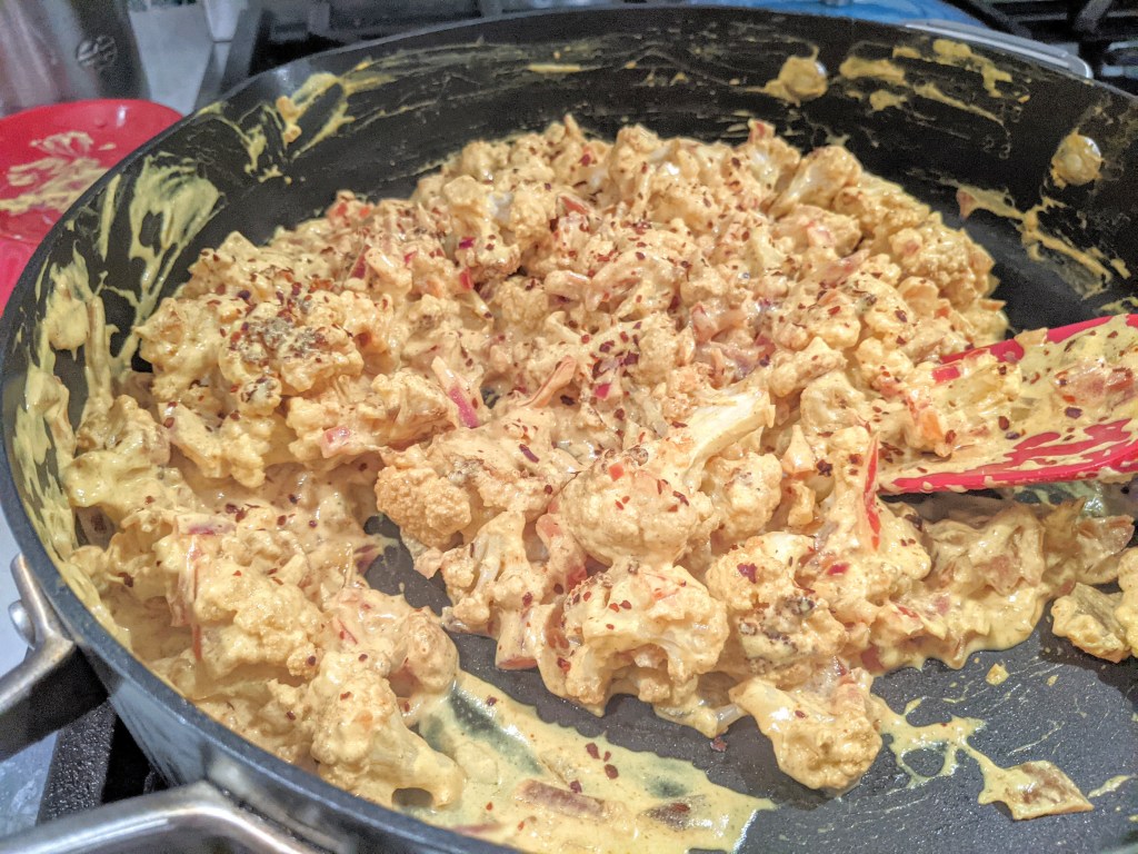 - When the cauliflower is done, add it to the pan. Stir to coat and then remove from heat.