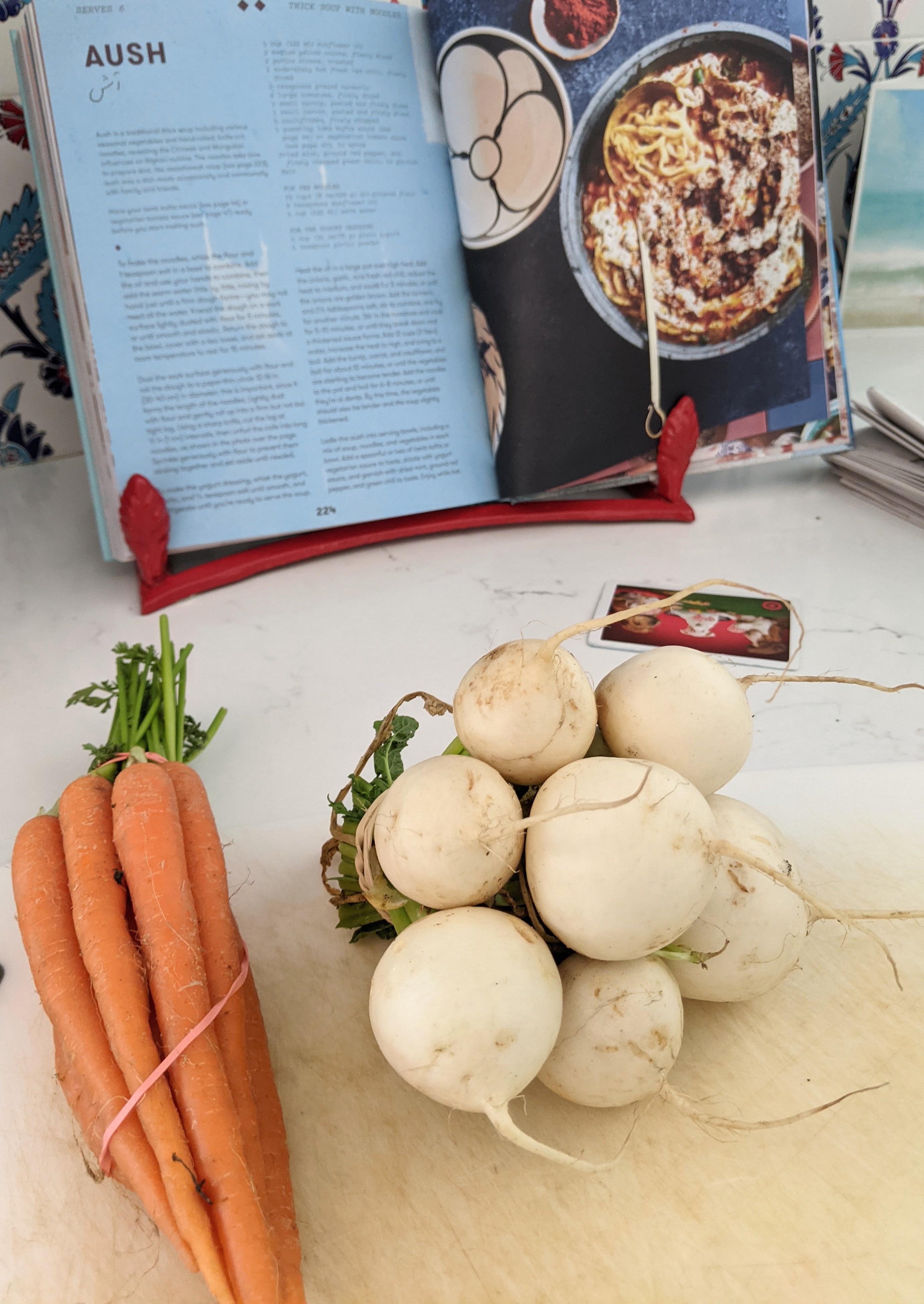 This was our first recipe attempt from Parwana, by Durkhanai Ayubi, May’s Cookbook Club selection. This is another cookbook we just knew we were going to love! It may end up at the top of the favorites list with Falastin and Stir Frying to the Sky’s Edge. We bookmarked half of the book to try and really love the food of this part of the world. This recipe did not disappoint! Aush (or ash) is probably most associated with Persian cuisine, but refers to thick soup with noodles that is also made in Afghanistan. (Ash/aush literally means “thick soup” in Persian.) While there are many variations of this type of soup, in Afghan cuisine it usually includes a tomato-based broth, various vegetables, thick noodles, a yogurt topping, and dried mint on top.