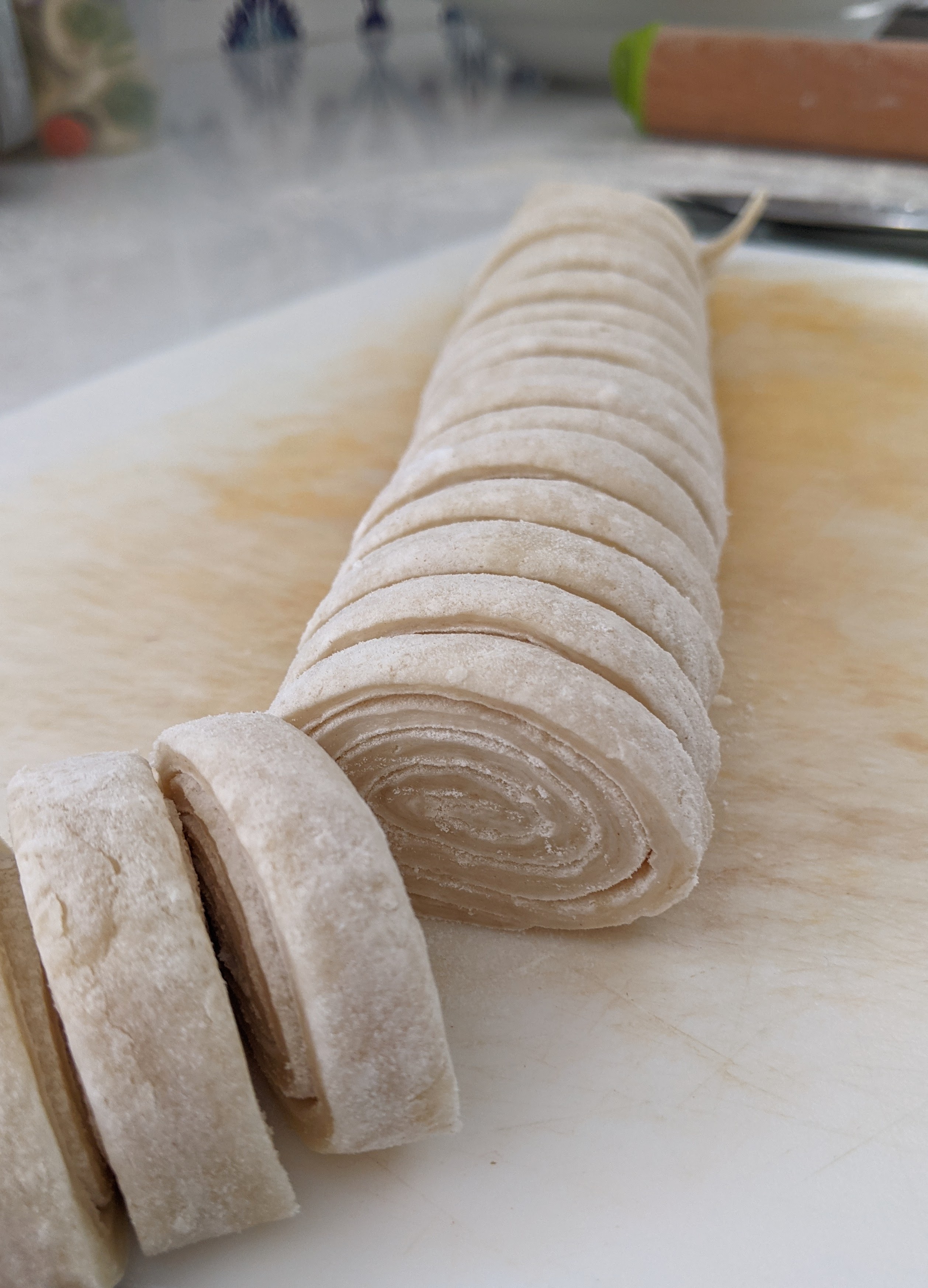 - Now roll out the noodle dough as thinly and evenly as possible, aiming for a 12-16 inch diameter circle. Then dust with flour and roll the circle into a log. Using a knife, slice into long 1/4 – 1/2 inch wide noodles. Dust with flour and set aside if not immediately ready to cook.