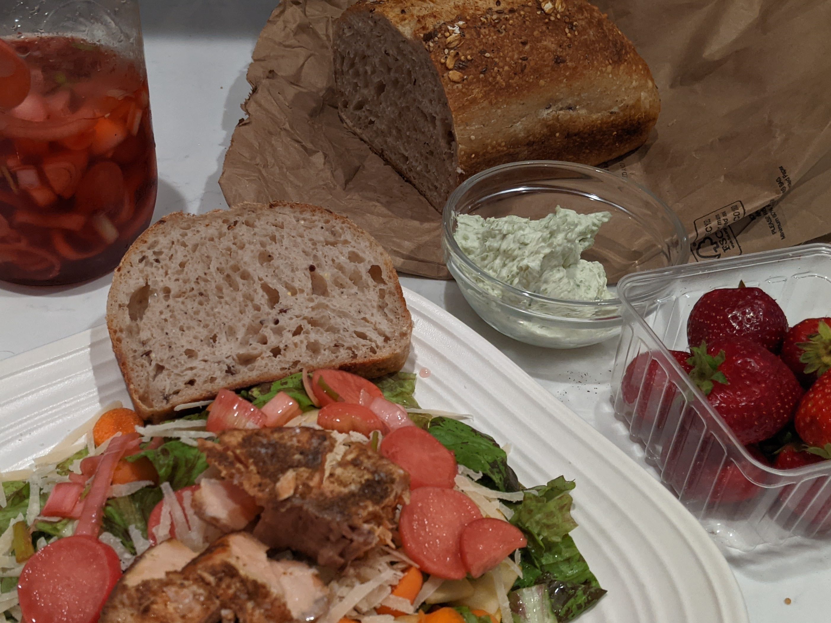 Farmer’s market season is here! We finally have joined a Farm Share, after wanting to for years. (See our farm’s explanation for those not familiar with the concept.) We’re hoping that this will help us to eat more locally grown and seasonal produce, as well as prompt us to try new items that we don’t usually reach for. So far it is working! In our share this week, we got garlic scapes, which we’ve never had before! Garlic scapes are the stalks that grow up above ground from hardneck garlic plants. Not only did we learn what they were this week, we also learned a farming tidbit. If the garlic scapes aren’t harvested, the plant expends energy supplying nutrients up the stalk so the plant flowers, which leaves less nutrients (= less size and flavor) for the below-ground garlic heads. So by harvesting and eating them, we’re helping grow more delicious garlic for later in the summer! But even more importantly, the garlic scapes are delicious themselves… they’re like a cross between garlic and onion… like a greener, herbier garlic flavor. They’re still strong and pungent and can be substituted for either ingredient depending on what you’re cooking and how ok you are with differing from your recipe. This week, we used some of our supply to make compound butter, which is AMAZING just slathered on bread. It would also be great to finish a steak or a pasta dish. Compound butter is one of those things that is so delicious and seems so fancy, but really requires minimal effort.