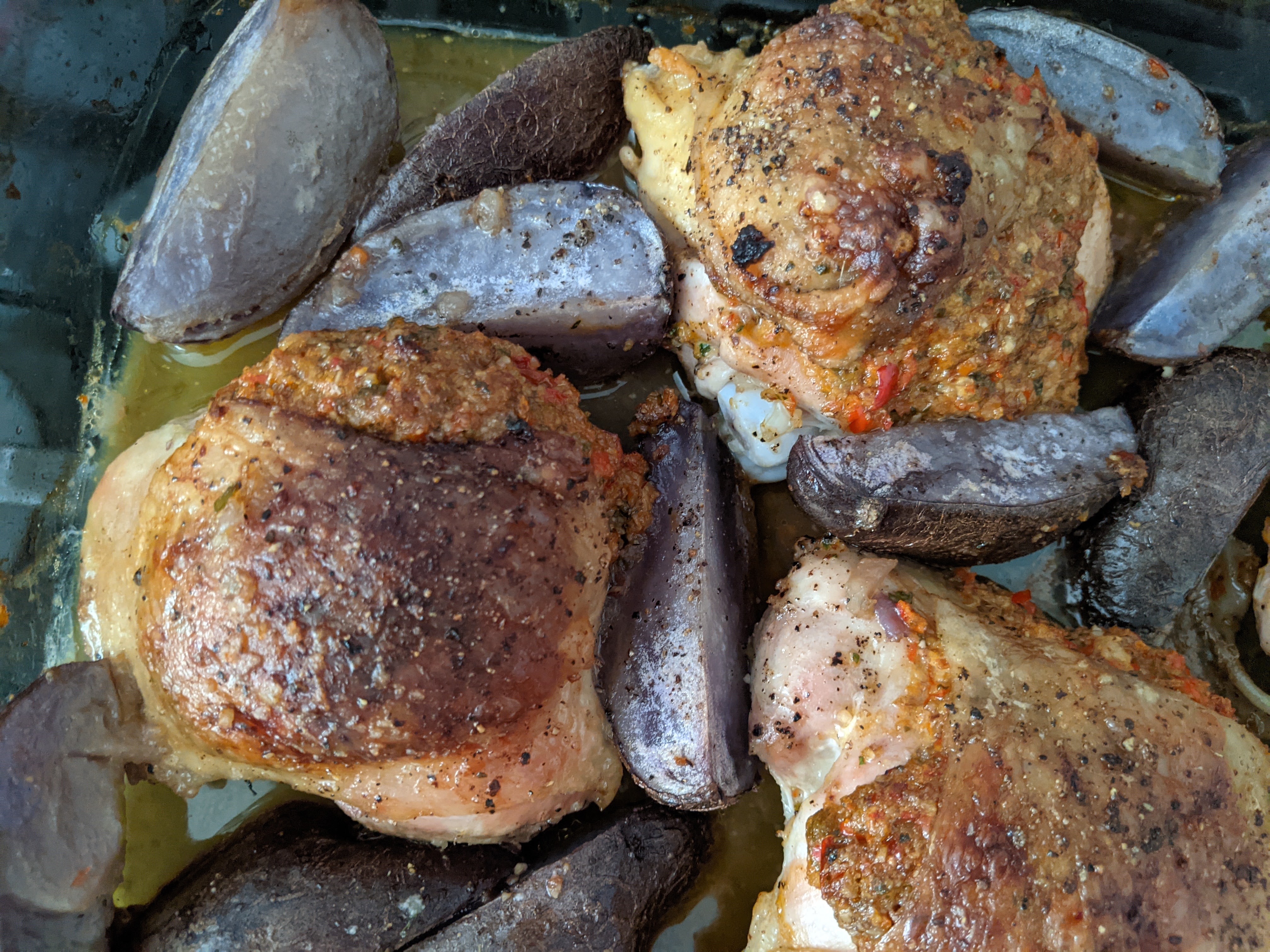 - Place the chicken thighs in a large, glass baking dish. Nestle the potato wedges around and in between the chicken pieces. Drizzle the entire dish with the remaining 1 tbsp of olive oil and season with additional fresh ground black pepper.
